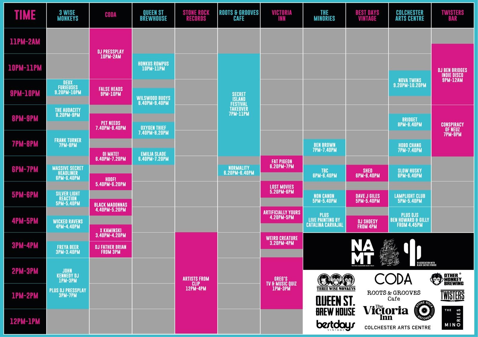 Best Days Vintage • CODA • Colchester Arts Centre • Queen Street Brewhouse • Roots & Grooves Café • Stone Rock Records • The Minories • The Victoria Inn • Three Wise Monkeys • Twisters Bar