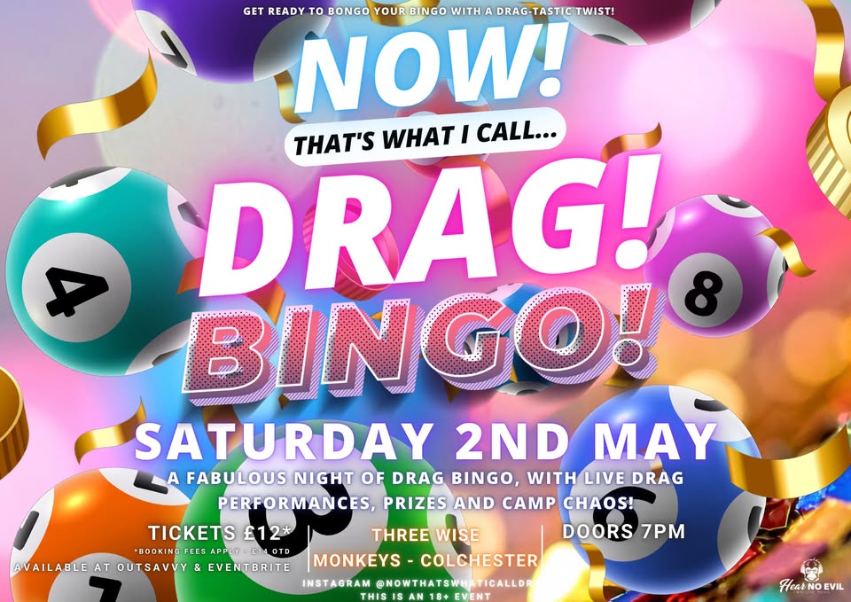 Shantay this way, Colchester, because “NOW! That’s What I Call…DRAG!” is coming to Three Wise Monkeys with DRAG BINGO this MAY! For the first time, they will be bringing you the latest edition of their fabulous DRAG BINGO show, expect a FABULOUS evening of games, drag performances, and camp chaos with a classic bingo twist!